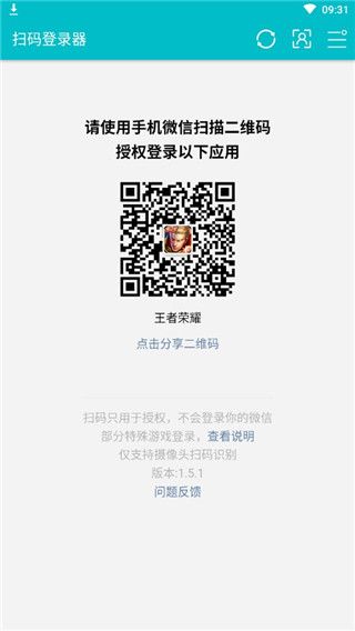 3、切换到游戏扫码登录器,出现二维码后点击分享给对方。