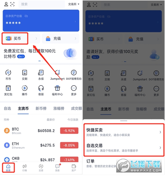 第一步:打开欧易APP,在首页点击买币按钮,选择快捷买卖/自选交易,此处以快捷买卖为例。
