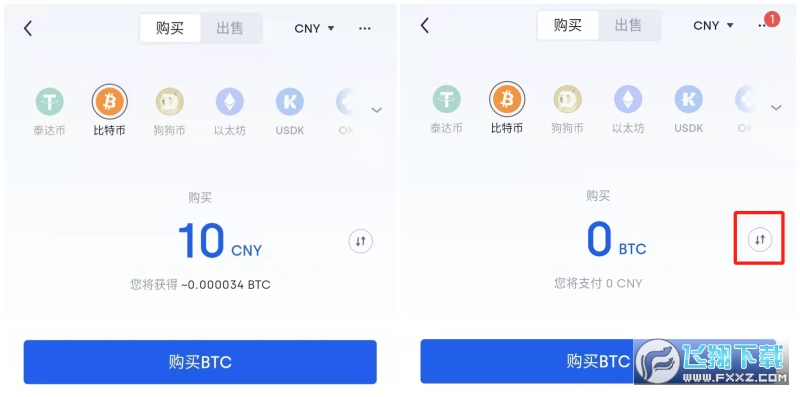 第二步:要购买的币种为BTC,输入需要购买的金额。点击如图所示的按钮即可切换成按币种数量购买。
